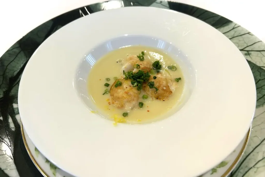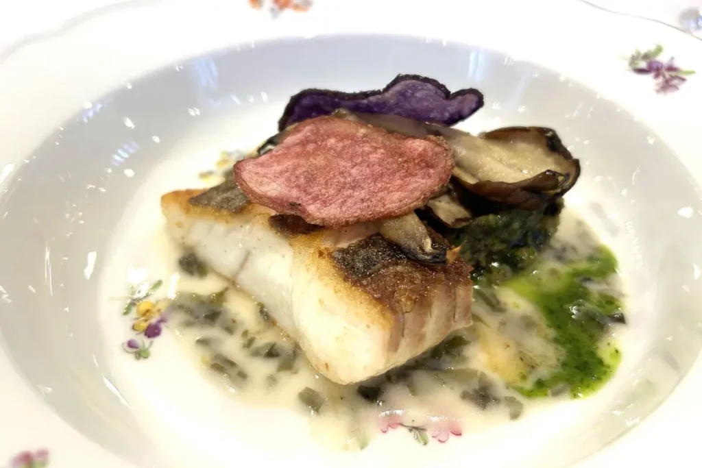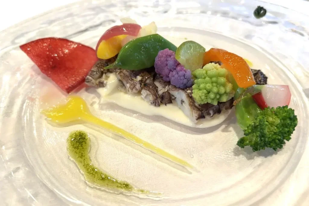 グリル銀鱗荘で提供されるのは、北海道産食材を使ったフレンチコース。「白菜のポタージュ・ピュレ 真ダチ 柚子の香り」は、表面をパリッと、中はとろっと焼き上げた真ダチと、クリーミーな白菜のピュレが一体となり、優しい味わい。さわやかなユズの香りがアクセントになっています。「小樽産開きシャコ カリフラワーのクリーム」は雄、雌各1匹のシャコを使い、雄の身と、抱卵した雌の卵と、両方のおいしさを味わうことができます。赤カブやインゲン、ロマネスコ、赤タマネギなど12種類の野菜がサラダ仕立てに盛られ、添えられたバターの香りのソースとバジルのソースで一口ごとに新しいおいしさを楽しめます。