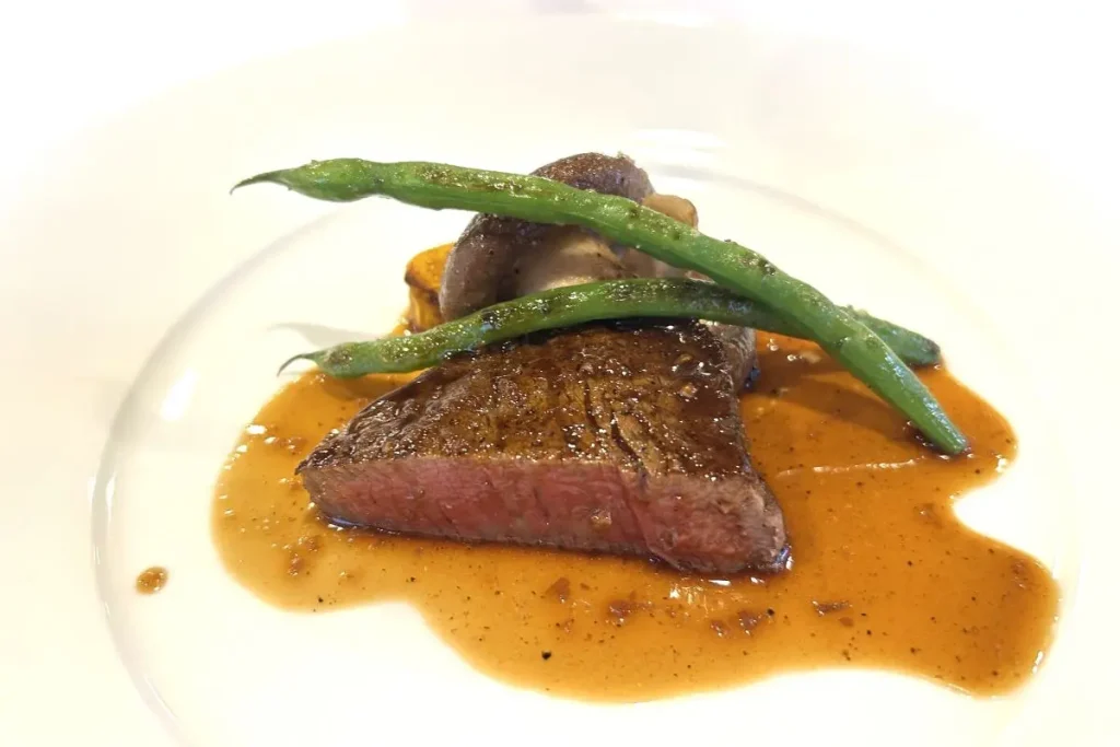 「苫前産活〆ヒラメ 海苔風味のソース 愛別舞茸 活蝦夷アワビのパセリ風味添え」は皮をパリッと、身をふっくらとグリルしたヒラメと磯の香りの高く弾力あるアワビに、バターの香り豊かな海苔のソースがたっぷりとかかっています。付け合わせは、うまみをぎゅっと凝縮させた舞茸のグリル。肉料理のメインは、ブランド牛肉「ガーネットビーフ『N34』の希少部位シャトーブリアン」。肉質は柔らかく、じゅわっと湧き出る脂の旨みを、コショウをきかせたさらっとしたガーリックソースが受け止めます。肉厚な上尾幌産シイタケ「極茸」と、甘みが強く、なめらかな食感の当麻町産カボチャ「黒王」が添えられています。