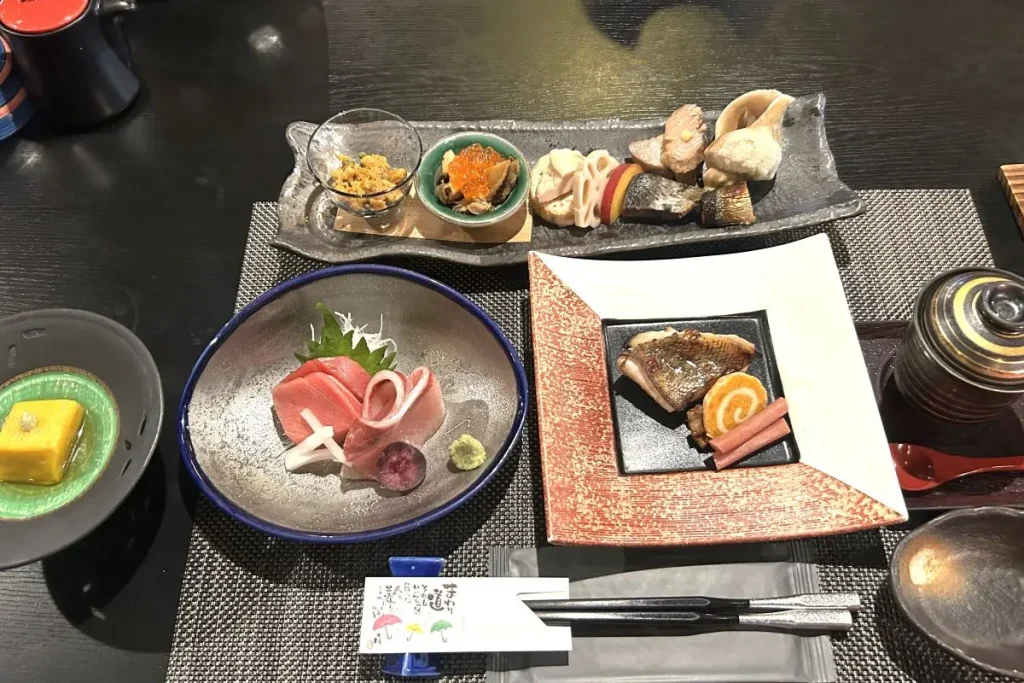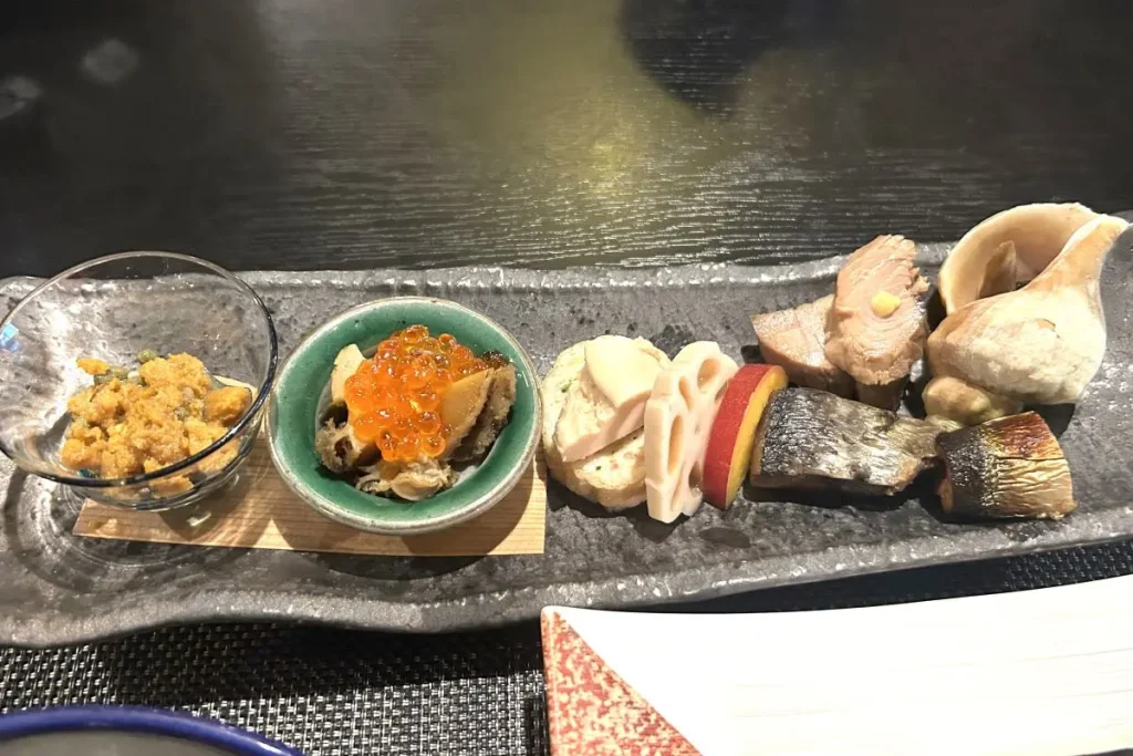 握り寿司や海鮮丼のほか、天ぷらや陶板焼きなどの一品料理が付いたコースもあります。この日のコースは、ニシンの重ね巻きなどの前菜、ずわいがにの爪と根菜の炊き合わせ、マグロや甘エビなどのお造り、黒毛和牛と野菜の陶板バター焼き、天ぷらなどに握り4貫とウニのミニミニ丼が付く盛りだくさんな内容でした。