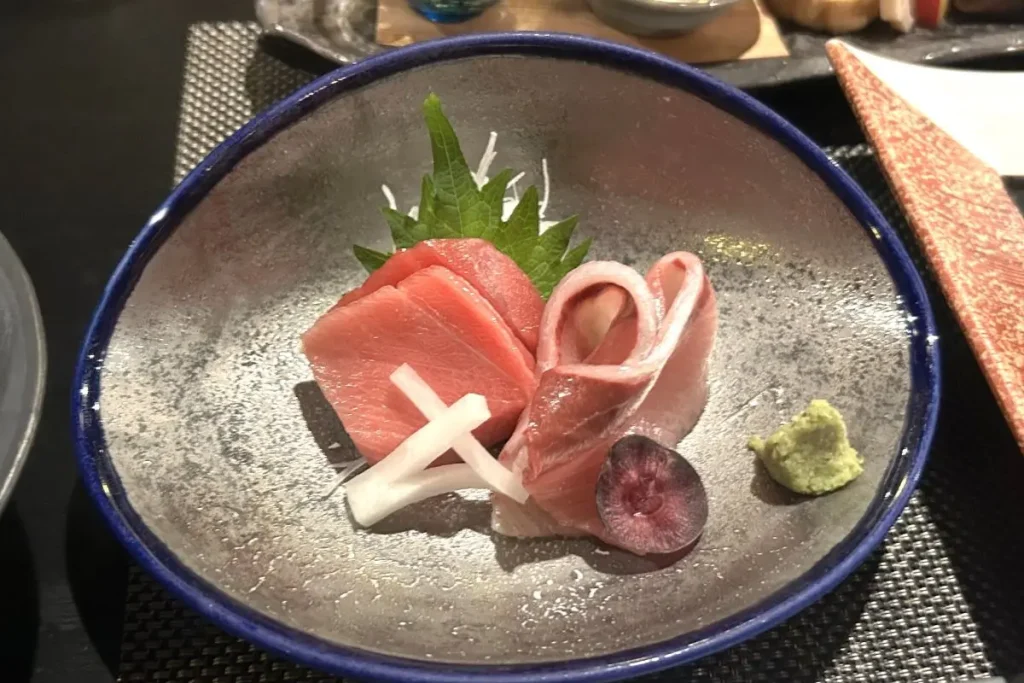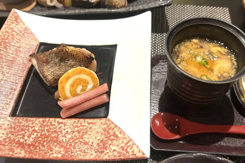 焼き物は積丹産ソイ。うろこを付けたまま、酒やしょうゆを合わせた「若狭地」をかけながら焼き上げており、うろこが口に残ることもなく、身はふっくら。八寸は積丹産ウニの山椒煮や柔らかく煮た積丹産アワビ、和からしを添えた積丹産マグロの煮付けなど、素材を活かし、さらに良さを引き出す工夫がされています。