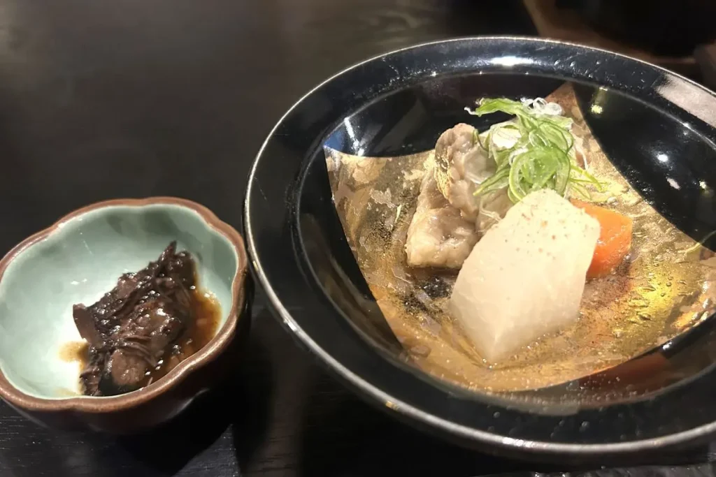 煮物は富良野和牛の煮込み。シンプルな塩味で、肉そのもののおいしさが引き立ちます。さっとかけられたコショウもいいアクセントです。「白身魚のフワフワ蒸し」は茶碗蒸しと間違うほど、プルプルでなめらかなすり身の蒸し物の中に、プチプチとしたとびっこが入っており、楽しい食感。積丹産の岩のり入りのあんがかけられており、磯の香りが上品に仕立て上げられています。