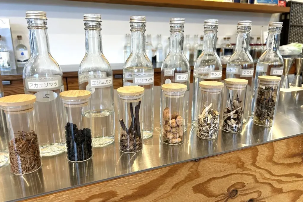 蒸溜所のショップ横には、6~7人が座ることのできるテーブルがあり、有料でブレンドのワークショップも実施しています。基本の積丹ドライジンを50~60%入れ、そこにシングルボタニカルスピリッツ7種類を、好みでブレンドしていきます。つくったオリジナルのジンは持ち帰ることができます。