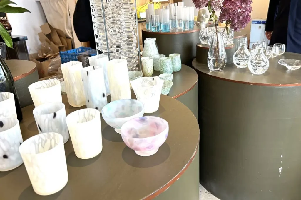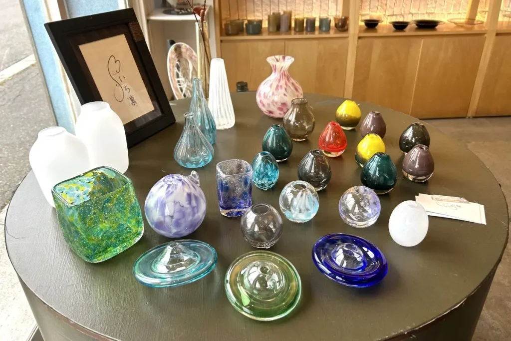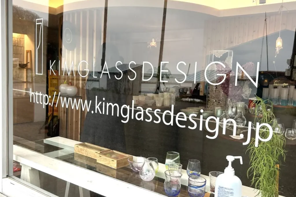旧青山別邸のある高台を下り、海沿いにあるガラス工房兼ショップ「KIM GLASS DESIGN」に立ち寄ります。ガラス作家の木村直樹さんが2011年に設立したガラス工房で、グラスや皿など日常の食卓に並ぶ食器から、オブジェまで幅広く扱っています。