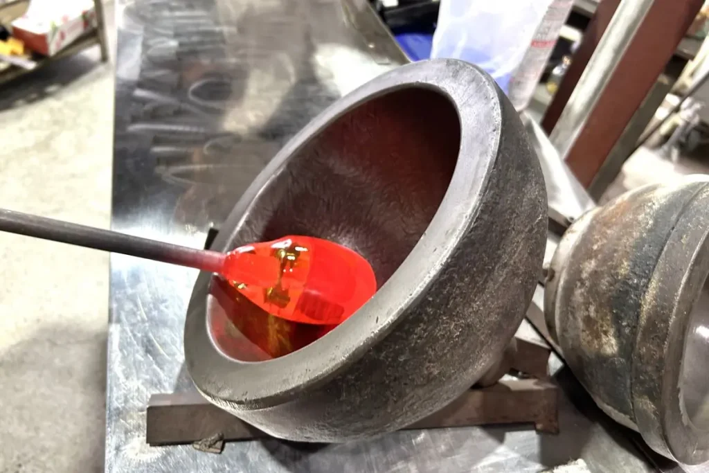 吹きガラスはグラスやボウルなど深みのある器より平らな皿の制作が難しいそうですが、木村さんのショップには直径40センチを超える大型の平皿もたくさん並んでいます。また、工房では薩摩切子や風鈴の下地もつくっており、これも、同じ物を均一につくる高い技術力の証明です。