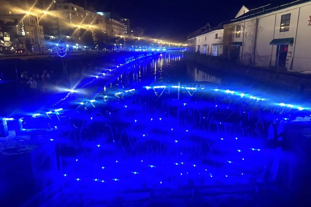 この時期、ぜひ見ておきたいのが、日没後の小樽運河周辺です。小樽観光協会の永岡朋子さんが案内してくれました。小樽運河は11月から1月までの3カ月間、「青の運河」と題して、日没から午後10時半まで、ライトアップされています。浅草橋から中央橋までの間を、海をイメージした青色のLED電球約1万個で彩ります。運河の水面にも青い光が反射し、幻想的な雰囲気に包まれています。