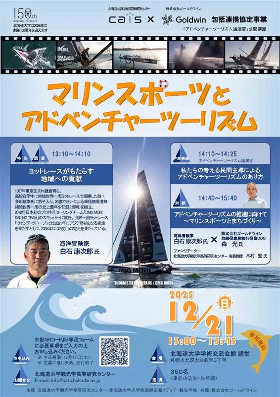 セミナーは12月21日(日)午後1時から。白石さんの講演の後、北大大学院国際広報メディア・観光学院の学生も「私たちの考える民間主導によるアドベンチャーツーリズムのあり方」と題し、研究成果を発表します。その後、「アドベンチャーツーリズムの推進に向けて~マリンスポーツとまちづくり~」をテーマに、白石さんとゴールドウイン取締役専務執行役員COOの森光さんが対談します。午後3時45分まで。