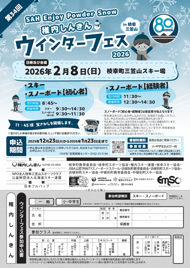 =NEW= SAH Enjoy Powder Snow 稚内しんきん in 枝幸三笠山 ウィンターフェス 2026 ※2/8(日)/枝幸町