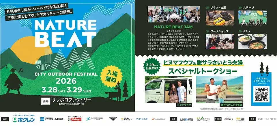 北海道のアウトドアカルチャーをサッポロファクトリーで体感できる「NATURE BEAT JAM」。人気アウトドアブランドが出展し、キャンプ場PRコーナー、キャンプ系インフルエンサーのトーク、焚き火体験といったアウトドアの魅力に触れられるイベントです。館内のアウトドアショップがワークショップを開催したり、旬なアーティストの無料ライブがあったり、北海道グルメが楽しめるゾーンを展開したりと、ファクトリー全体が春のわくわく感に包まれます。北海道のアウトドアカルチャーフェス、ぜひお楽しみください。