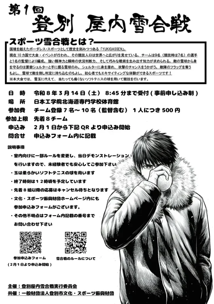 | 【問い合わせ】 090-6247-1854 登別屋内雪合戦実行委員会 |