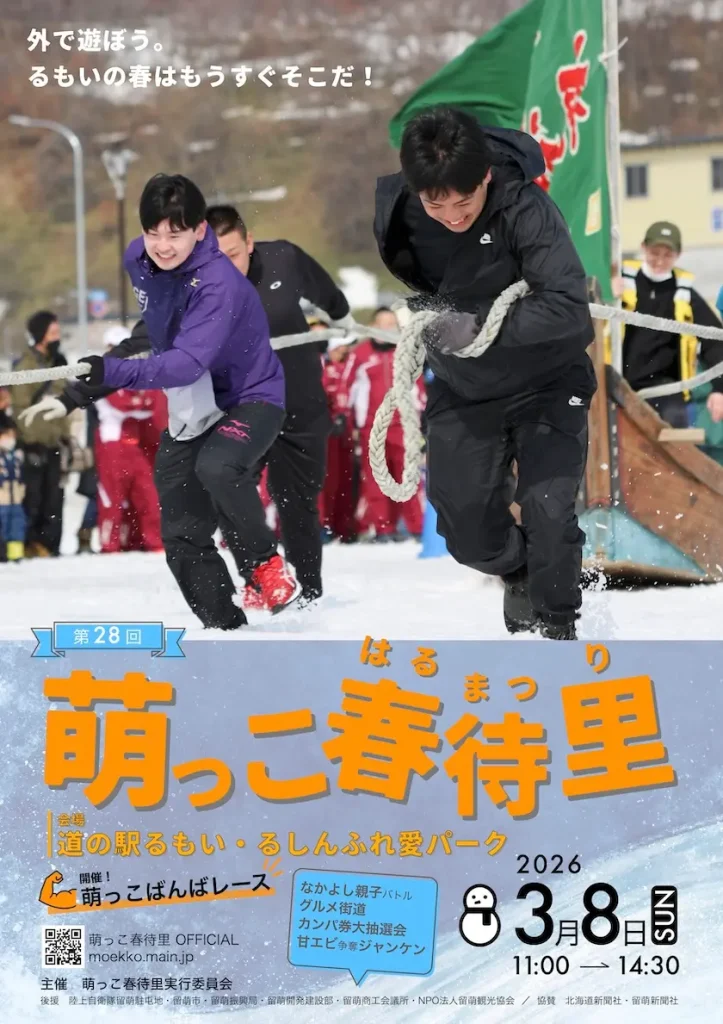 留萌市に春を呼ぶイベント「萌っこ春待里(はるまつり)」が開催されます。目玉は、ニシン漁で栄えた歴史を伝える「萌っこばんばレース」です。大漁祈願の想いを込め、約700キロのニシン舟をチームで引いて雪上を疾走する姿は迫力満点!今年は総勢24チームによる熱いトーナメント戦が繰り広げられます。会場ではグルメ街道や甘エビ争奪ジャンケンなど、親子で楽しめる催しも満載です。また、イベントを支える「カンパ券(1枚500円)」を購入すると、旅行券やSwitch2などが当たる大抽選会への参加や、当日の無料シャトルバス利用といった特典が受けられます。 外遊びを楽しみながら、みんなで留萌の春を盛り上げましょう!詳細は公式サイトをご確認ください。
