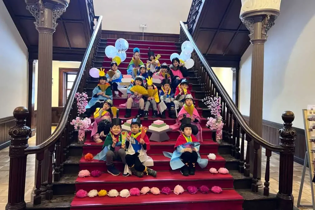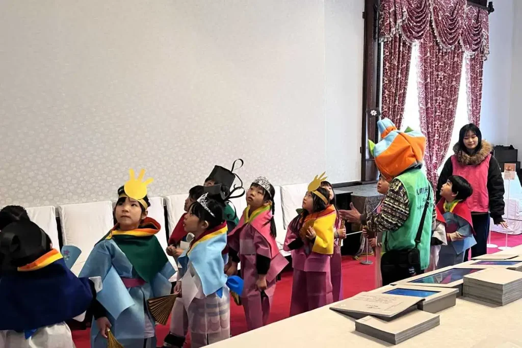 2月27日(金)には、札幌市中央区の保育所「こどもカンパニー」の年長さん15人が赤れんが庁舎を訪れました。子どもたちは、ひな人形を模したピンクや水色の衣装やティアラ、烏帽子を身に着け、桧扇(ひおうぎ)や笏(しゃく)を持って、ひな壇に見立てた階段に整列。笑顔で記念撮影しました。