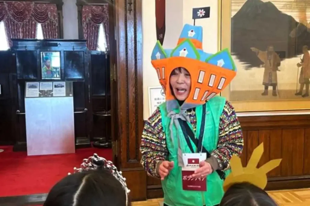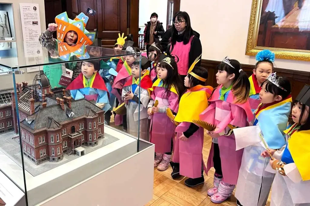 子どもたちはその後、ボランティアガイドの山田栄子さんの案内で、赤れんが庁舎を見学。山田さんが「『3匹の子豚』のお話の中で、一番頑丈なおうちは、何でできていたかな」と尋ね、子どもたちが元気に「れんが!」と答えると、山田さんは「赤れんが庁舎には、そのれんがが使われています。100年よりもっと昔に完成して、今もこうして残っています」と説明しました。