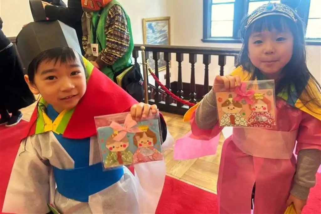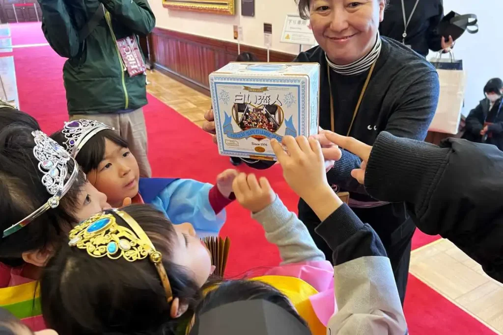 子どもたちには、「ひな人形体験」で撮影した写真をプリントした「白い恋人」のオリジナル缶と、ボランティアガイドが手作りしたひな人形のカードがプレゼントされました。子どもたちは「服がかわいくて、わくわくした」「写真を撮れてよかった」「かわいかった」と喜んでいました。